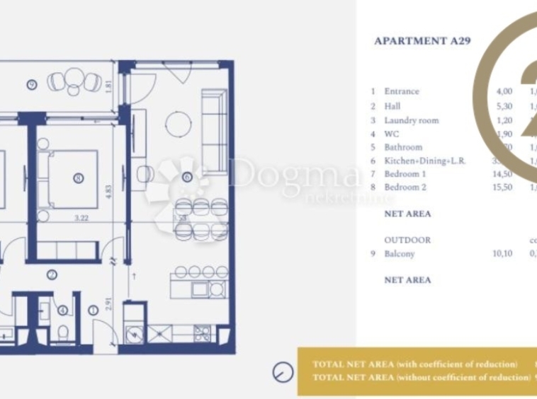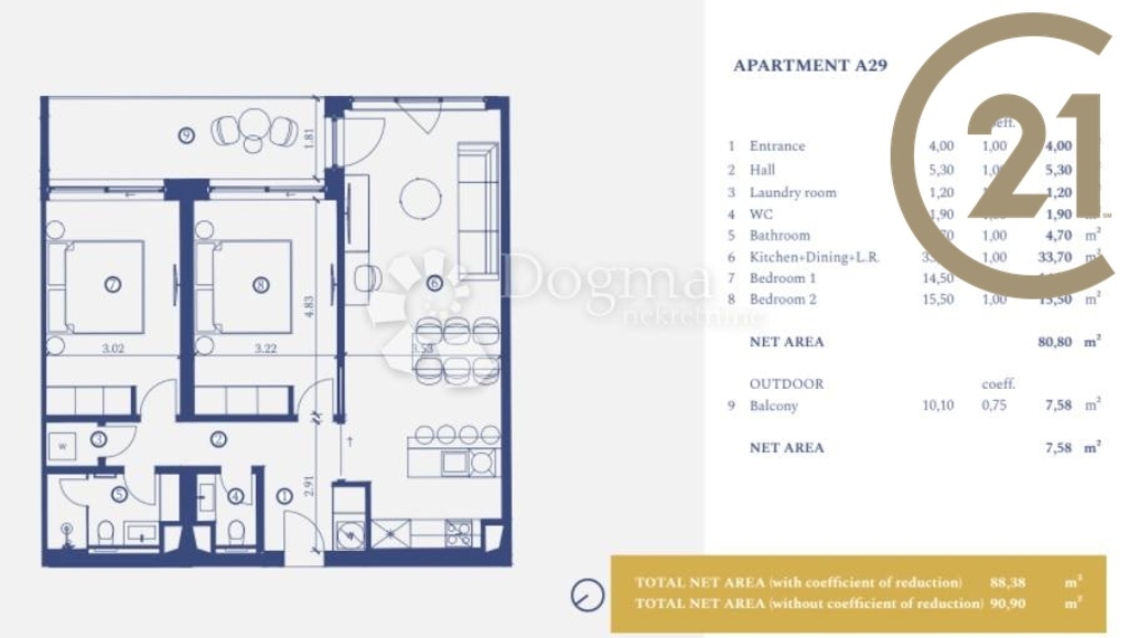 Předmětný byt se nachází ve 2. patře o celkové výměře 90,90 m². Skládá se z chodby, koupelny, 2 ložnic, velkého obývacího pokoje, kuchyně a balkonu s úchvatným výhledem na Alpy, Grado a Benátky.