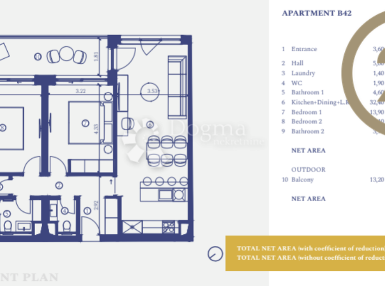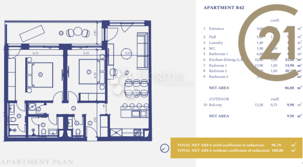 Apartmán se nachází ve východní části letoviska s krásným výhledem na venkovní bazén a perfektní východy slunce. Skládá se z chodby, prádelny, kuchyně s jídelnou, obývacího pokoje, toalety, dvou koupelen a dvou ložnic. Velikost balkonu je 15,20 m2 (11,40 m2 s koeficientem).