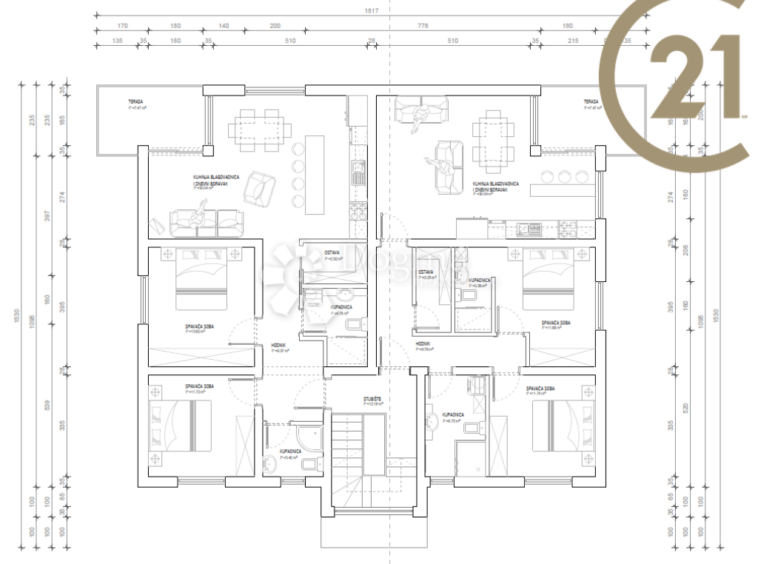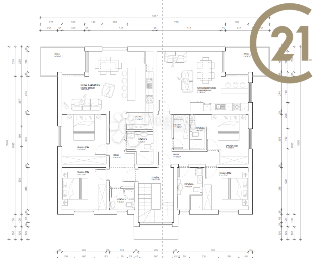 Byt v prvním patře má kuchyň, obývací pokoj, 2 ložnice, 2 koupelny a kotelnu a má přístup na střešní terasu o rozloze 100 m2.